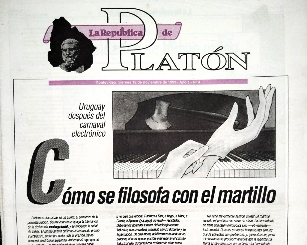 Quiero confesar aquí que yo fui uno de esos mutantes y que amarillea en una caja mi colección de «La República de Platón». Fueron aquellas lecturas las que me hicieron entender mucho de lo que estaba pasando en mi entorno. Por ejemplo un sketch en un programa de humor podía servir para interpretar el discurso político de Sanguinetti. Es el caso de «Las Rivarolas», un grupo de hombres vestidos de mujer que emulaban gestos de la alta cultura en Decalegrón, un programa de humor que se veía en la televisión de mi casa por esos años. Con el paso del tiempo, «Las Rivarolas» se volvieron una categoría de análisis que servía para entender ciertos aspectos de la cultura uruguaya contemporánea. «La República de Platón» dejo un virus incubando que poco a poco nos fue comiendo la cabeza. Inserto un video de 1986 de «Las Rivarolas», grabado para Hiper Humor, un programa hecho en Argentina por el mismo elenco.