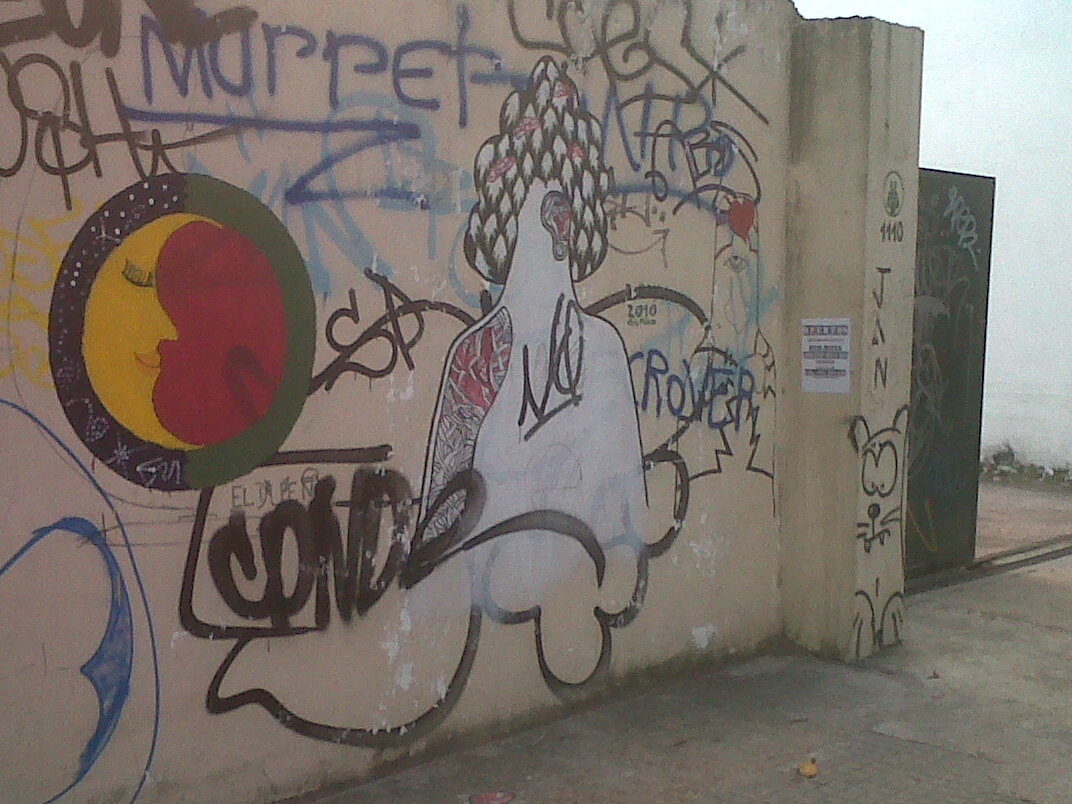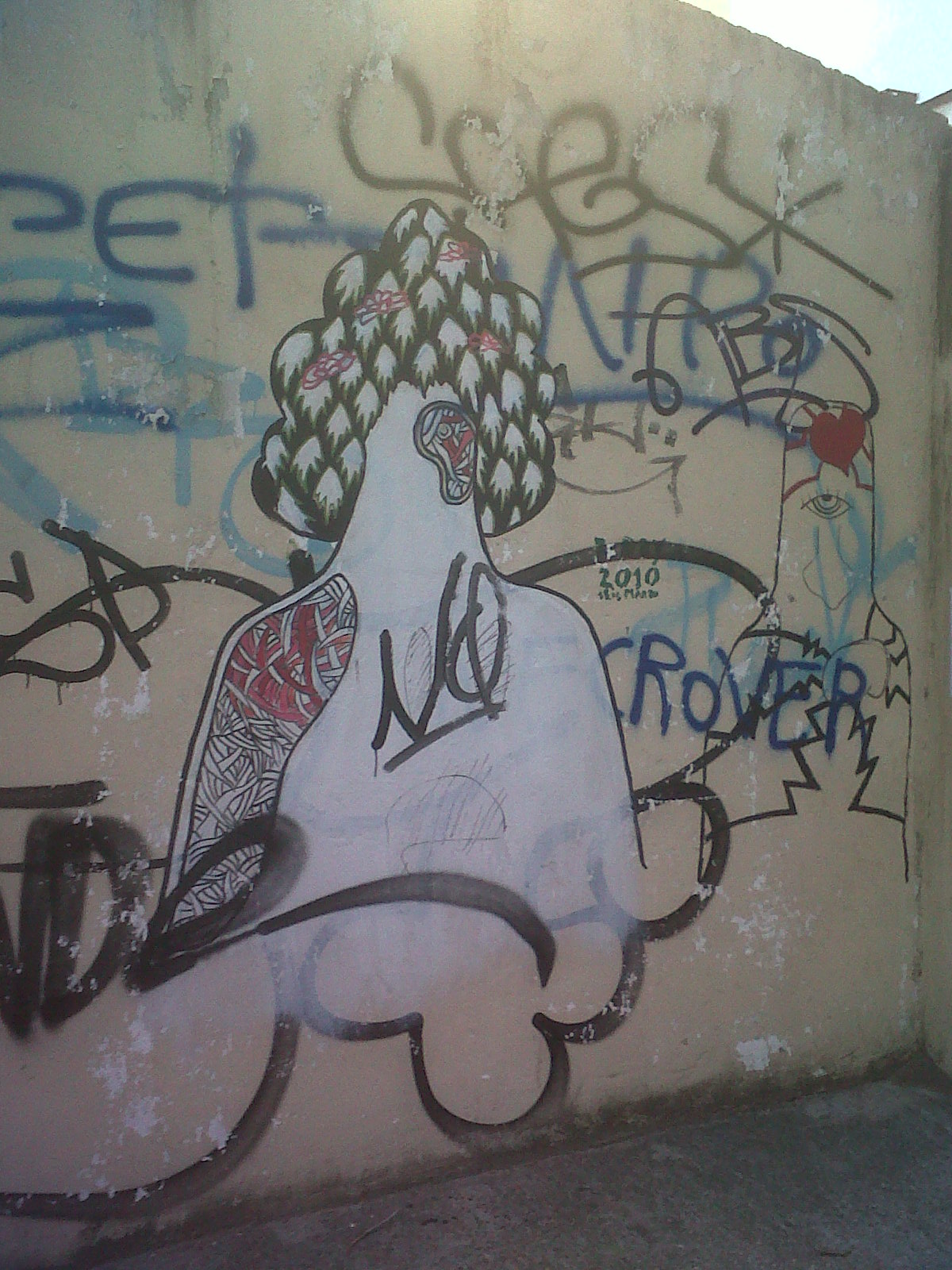 Eso es lo que pasó en Soriano casi Paraguay. La pared está en la entrada de un estacionamiento privado. Está “sucia”. Hay muchas cosas escritas. Un conjunto desparejo de noctámbulos ha escrito y dibujado en la pared incansablemente. Pero hay un dibujo que se destaca. Parece un cuerpo. Humano. Nervios y tendones se entretejen bajo una manta blanca que oficia de piel. Arriba podría tener una cabeza con una peluca negra y flores. Hay orificios en la piel desde donde puedo ver el interior. Es rojo. Pero no hay ojos, no hay boca, no hay narinas.
