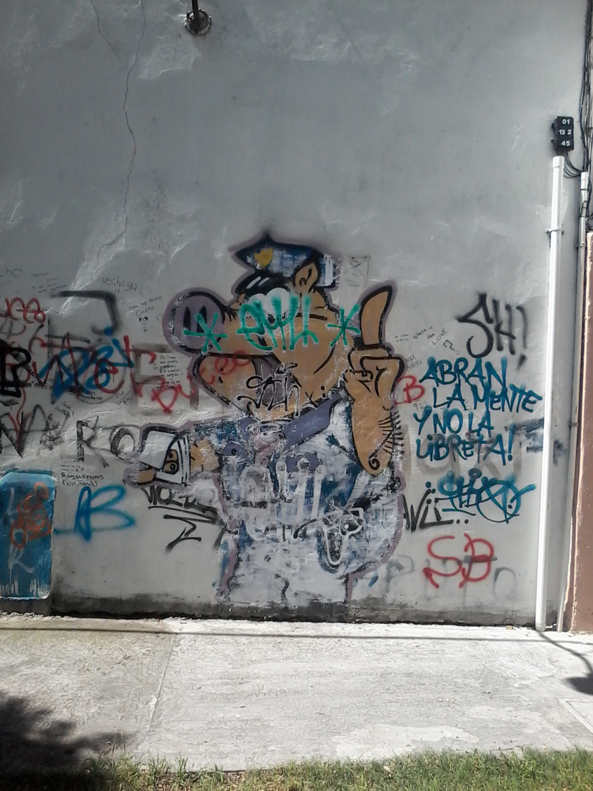Pasaron dos años. Cada tanto, en los días más soleados, veía algunos rasgos del chancho detrás de la pintura blanca que me permitían recuperar en la memoria aquel primer acercamiento con el dibujo. Pero ayer me llevé una sorpresa. Después de unas intensas lluvias el chancho emergió rozagante y triunfador. Y además con una leyenda nueva: “Abran la mente y no la libreta”.