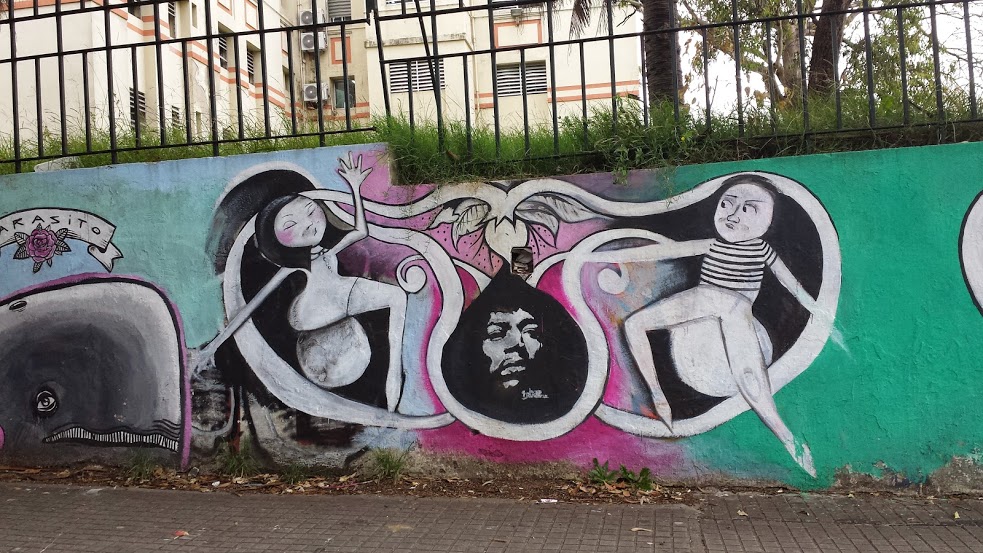 Al lado de la ballena que está siendo descuartizada en vida está este dibujo que toma una imagen prediseñada, una foto de Jimi Hendrix, que es una cita perfecta para el diseño medio psicodélico de este artista callejero que no firmó y no pude reconocer.