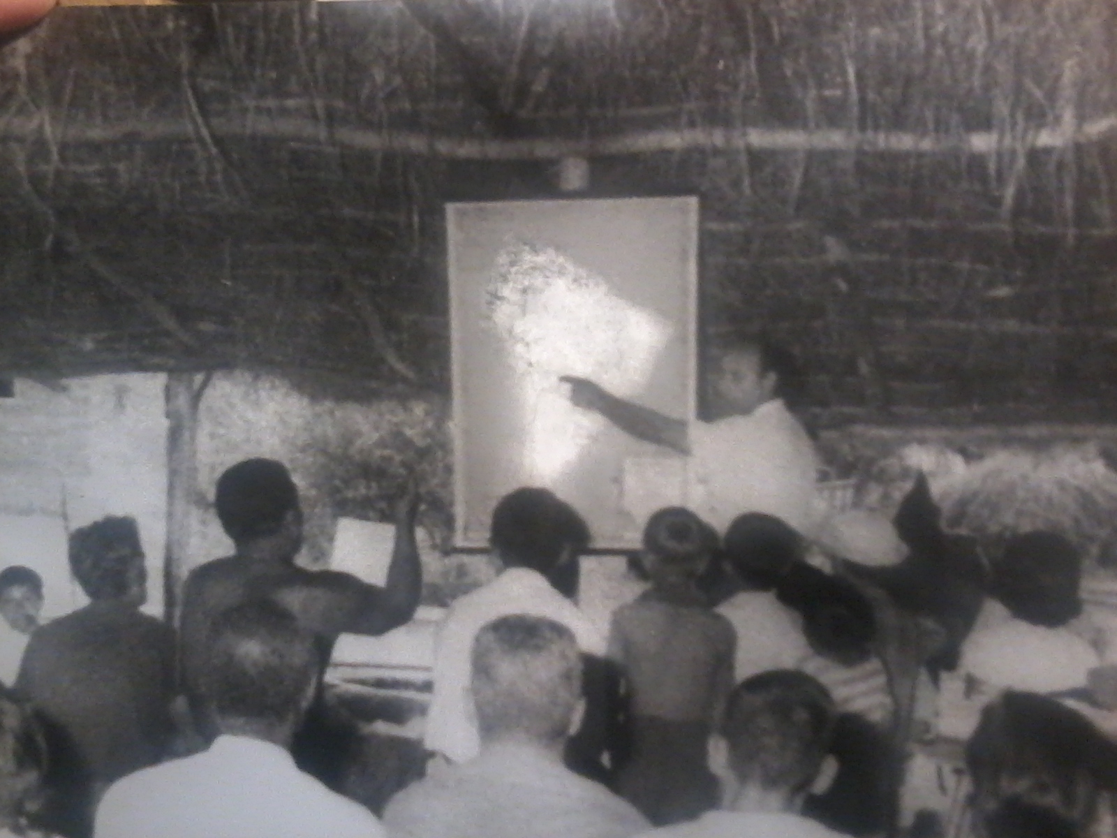 La profesora Cristina Porta, hija de Eliseo Salvador, me mostró una foto de su padre intercambiando con los peludos frente a un mapa de América del Sur.