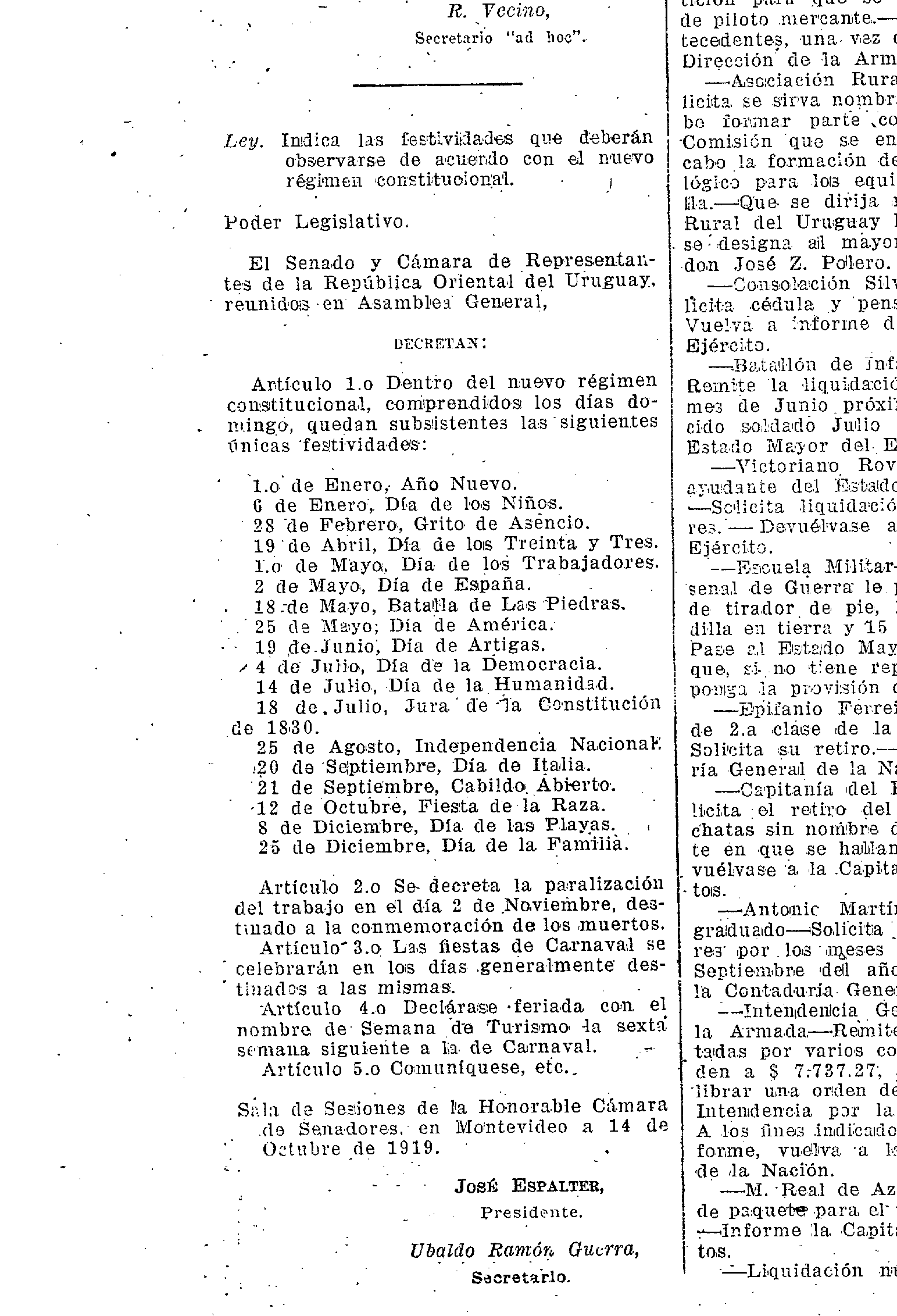 En fin, hicimos los mandados. La ley N° 6.997 promulgada el 23 de octubre de 1919, declaró los feriados en Uruguay y estableció el 12 de octubre como “fiesta de la raza”. No tengo idea de si esta ley está vigente, sé que la dictadura mandó un decreto ley en el que estableció “feriados nacionales de carácter tradicional” (N° 14.977) entre los que se encuentra el 12 de octubre pero sin nombre.